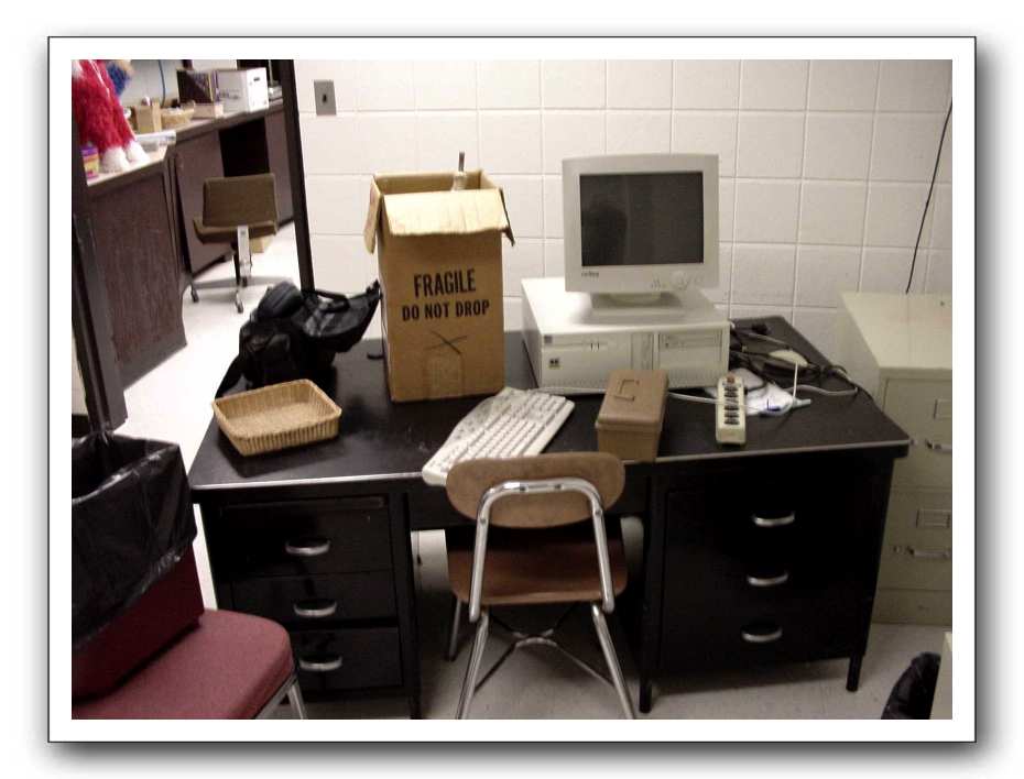The carpet is gone, apparently a casulty of flooding. This picture was taken in the office. The doorway to the hall is behind the photographer. The engineering workbench is through the doorway on the left.