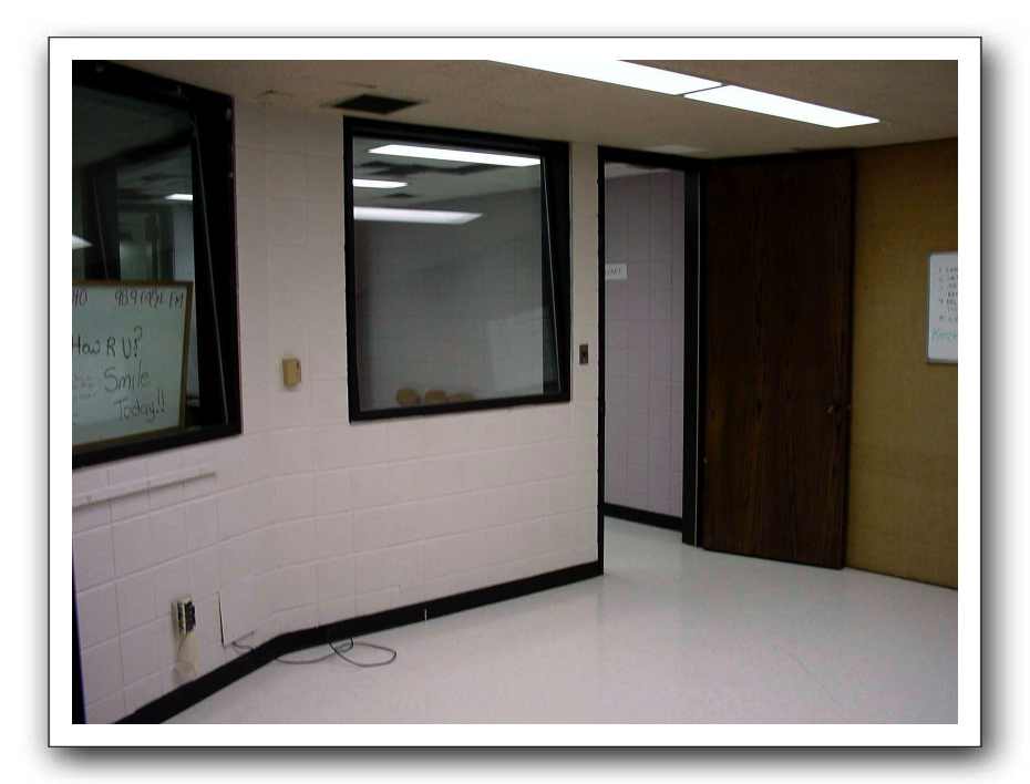 Sandy Ballin visited the RC campus in the Fall of 2004 and found the lower Burpee WRCR studios abandoned. The carpet is gone, apparently a casulty of flooding. This picture was taken in Studio A. The control room is through the window on the left. Straight ahead through the door is studio B.